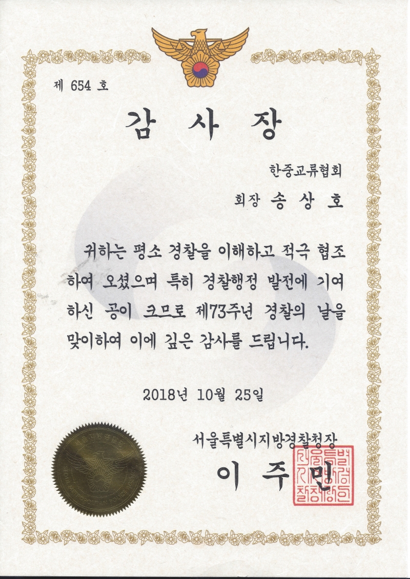 Áö³­ 2018³â 12¿ù 8ÀÏ Á¦ 73 Áֳ⠰æÂûÀÇ ³¯À» ¸ÂÀÌÇÏ¿© Æò ¼Ò °æÂûÀ» ÀÌÇØÇϰí Àû±ØÇùÁ¶ ÇÏ¿© °æÂûÇàÁ¤ ¹ßÀü¿¡ ±â¿©ÇÏ ½Å °øÀ» ÀÎÁ¤¹Þ¾Æ ÇÑÁß±³·ùÇù ȸ ¼Û»óÈ£ ȸÀåÀº °¨»çÀåÀ» ¼ö ¿©¹Þ¾Ò´Ù. ÇÑÁßµ¿Æ÷½Å¹® ¼Û»ó È£ ȸÀåÀº ¾ÕÀ¸·Îµµ µ¿Æ÷µéÀÇ Àαǰú ¿©·¯ ºÐ¾ß¿¡¼­ ¿­½ÉÈ÷ ÀÏÇϰí ÀÖ´Â µ¿Æ÷µéÀÇ »îÀÇ Áú À» ³ôÀ̱â À§ÇØ ²ÙÁØÈ÷ ³ë·ÂÇÏ °Ú´Ù°í ¸»Çß´Ù.