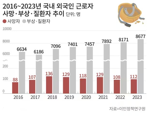 À̹ÎÁ¤Ã¥¿¬±¸¿øÀÌ ¿ÃÇØ ¹ß°£ÇÑ ¡®¿Ü±¹ÀÎ ±Ù·ÎÀÚ ¾÷¹«»óÀÇ ÀçÇØ ÇöȲ ºÐ¼®¡¯ º¸°í¼¿¡ µû¸£¸é ±¹³» »ê¾÷ ÇöÀå¿¡¼ »ç°í·Î ¼ûÁø ¿Ü±¹ÀÎ ±Ù·ÎÀÚÀÇ ¼ö´Â Áö³ 2017³â ÀÌÈÄ 2023³â±îÁö 7³â ¿¬¼Ó ¿¬°£ 100¸íÀ» ³Ñ¾î¼¹´Ù. »êÀç·Î ÀÎÇÑ ºÎ»óÀÚ¡¤ÁúȯÀÚµµ 2017³â 6186¸í¿¡¼ 2023³â 8677¸íÀ¸·Î ¸Å³â Áõ°¡ÇÏ´Â Ãß¼¼´Ù.