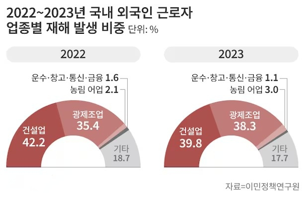 ¾÷Á¾º°·Î º¸¸é Áö³ 2023³â ±âÁØ ¿Ü±¹ÀÎ ±Ù·ÎÀÚÀÇ ¾÷¹«»ó »ç°í Áß 78.1%´Â °Ç¼³¾÷°ú ±¤¡¤Á¦Á¶¾÷¿¡¼ ¹ß»ýÇÑ °ÍÀ¸·Î ³ªÅ¸³µ´Ù. °Ç¼³¾÷ÀÌ Àüü »ç°íÀÇ 39.8%¸¦ Â÷ÁöÇß°í, ±¤¡¤Á¦Á¶¾÷ÀÌ 38.3%·Î µÚ¸¦ À̾ú´Ù. ¿¬±¸¿øÀº ¡°Àüü ¿Ü±¹ÀÎ ±Ù·ÎÀÚ Áß °Ç¼³¾÷¿¡ Á¾»çÇÏ´Â ºñÀ²Àº 12%¿¡ ºÒ°úÇÏ´Ù¡±¸ç ¡°À̸¦ °¨¾ÈÇÏ¸é ´Ù¸¥ ¾÷Á¾¿¡ ºñÇØ »ó´çÈ÷ ¸¹Àº »ç°í°¡ ¹ß»ýÇÑ °ÍÀ¸·Î ºÁ¾ß ÇÑ´Ù¡±°í ÁöÀûÇß´Ù.