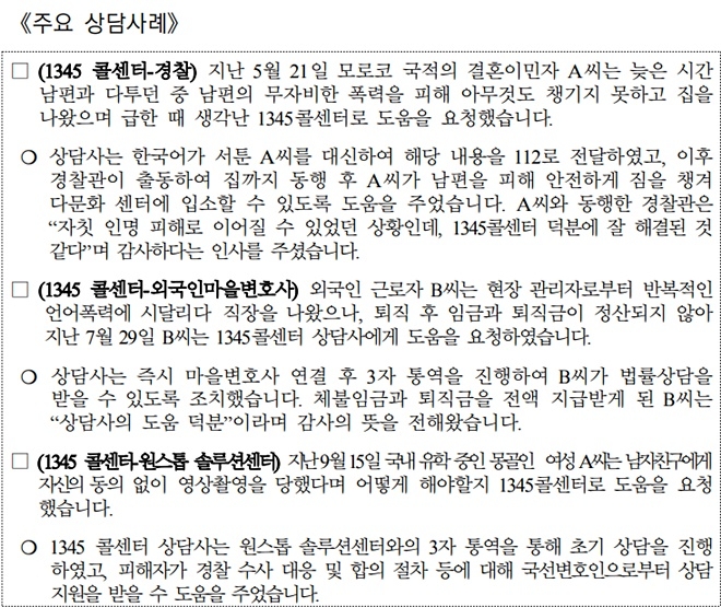 ¼¿ïÃâÀÔ±¹¡¤¿Ü±¹ÀÎû ¿Ü±¹ÀÎÁ¾Çվȳ»¼¾ÅÍ(ÀÌÇÏ 1345Äݼ¾ÅÍ)´Â Áö³ 9¿ù 1ÀϺÎÅÍ´Â ¹üÁËÇÇÇØÀÚ ¿ø½ºÅé¼Ö·ç¼Ç¼¾ÅÍ¿ÍÀÇ Çù·Âü°è¸¦ ±¸Ãà, 20°³ ¾ð¾î·Î ¹üÁË ÇÇÇØ ¹× ÀÓ±ÝüºÒ ÇÇÇØ¸¦ ÀÔÀº ¿Ü±¹Àο¡ ´ëÇÑ Å뿪 Áö¿øÀ» Çϰí ÀÖ´Ù°í 25ÀÏ ¹àÇû´Ù.