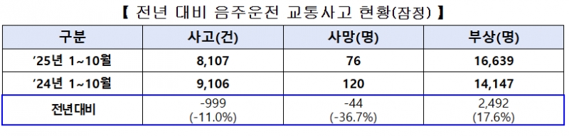 °æÂûû¿¡¼´Â Áö¼ÓÀûÀÎ À½ÁÖ¿îÀü Ưº°´Ü¼Ó ¹× ÁýÁß È«º¸, À½ÁÖ ÃøÁ¤¹æÇØ ÇàÀ§(ÀÏ¸í ¼úŸ±â) ó¹ú µîÀÇ ¿µÇâÀ¸·Î 2025³â 10¿ù 31ÀÏ ±âÁØ À½ÁÖ »ç°í(-11.0%, 9,106°Ç¡æ8,107°Ç) ¹× »ç¸ÁÀÚ(-36.7%, 120¸í¡æ76¸í)°¡ Å« ÆøÀ¸·Î °¨¼ÒÇϰí ÀÖ´Ù.