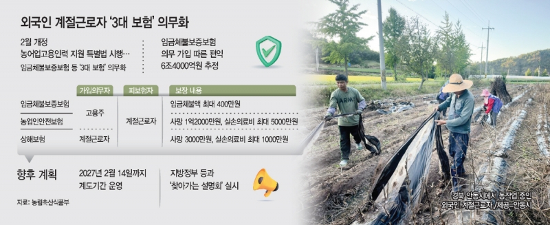 ¾Õ¼ ³ó½ÄǰºÎ´Â °³Á¤ Ưº°¹ýÀÌ Áö³ 15ÀÏ º»°Ý ½ÃÇàµÊ¿¡ µû¶ó ¿Ü±¹ÀÎ °èÀý±Ù·ÎÀÚ¸¦ °í¿ëÇÏ´Â ³óÀåÁÖ°¡ ÀÓ±ÝüºÒº¸Áõº¸Çè¿¡ Àǹ« °¡ÀÔÇϵµ·Ï Çß´Ù. º¸ÇèÀº SGI¼¿ïº¸Áõº¸Çè¿¡¼ ´Üµ¶ Ãë±ÞÇÏ¸ç °í¿ëÁÖ´Â ±Ù·Î°è¾àÈ¿·Â ¹ß»ýÀϷκÎÅÍ 30ÀÏ À̳»¿¡ °¡ÀÔÇØ¾ß ÇÑ´Ù. º¸Çè·á´Â ¿Ü±¹Àη 1¸í´ç 8°³¿ù ±âÁØ 6500¿øÀÌ´Ù. ÀÔ±¹ ½Ã ÇÑ ¹ø¸¸ ³³ºÎÇÏ¸é µÈ´Ù. ±Ù·ÎÀÚ´Â ÀÓ±Ý Ã¼ºÒÀÌ ¹ß»ýÇÒ °æ¿ì ÃÖ´ë 400¸¸¿ø±îÁö º¸Àå¹ÞÀ» ¼ö ÀÖ´Ù.