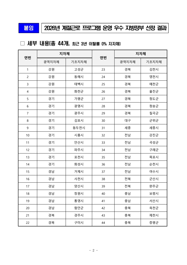 ¹ý¹«ºÎ(Àå°ü Á¤¼ºÈ£)´Â Áö³­ ÇÑ ÇØ °èÀý±Ù·Î ÇÁ·Î±×·¥À» ¾ÈÁ¤ÀûÀ¸·Î ¿î¿µÇÑ 44°³ ±âÃÊÁö¹æÁ¤ºÎ¸¦ ¡®2026³â °èÀý±Ù·Î ÇÁ·Î±×·¥ ¿î¿µ ¿ì¼ö Áö¹æÁ¤ºÎ¡¯·Î ¼±Á¤Çß´Ù°í ¹àÇû½À´Ï´Ù.